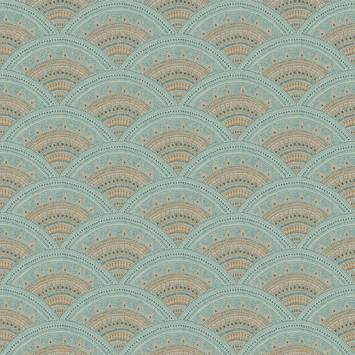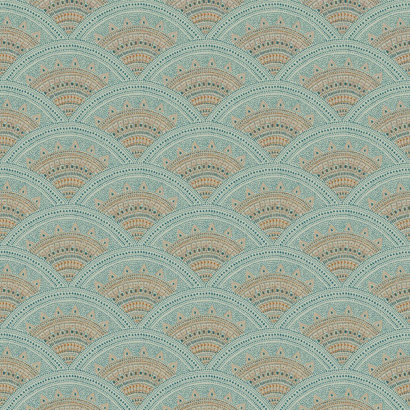 Arabesque brocade Wallpaper with fans in blue and copper by Khroma, Bahia collection. Washable and Non-woven quality, size: 53 cm x 10 m.
