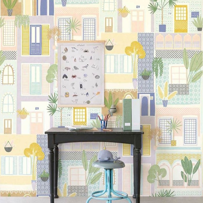 Wall mural kids neighborhood houses and pastel plants by Eijffinger, Explore collection. Size: 212 x 280 cm