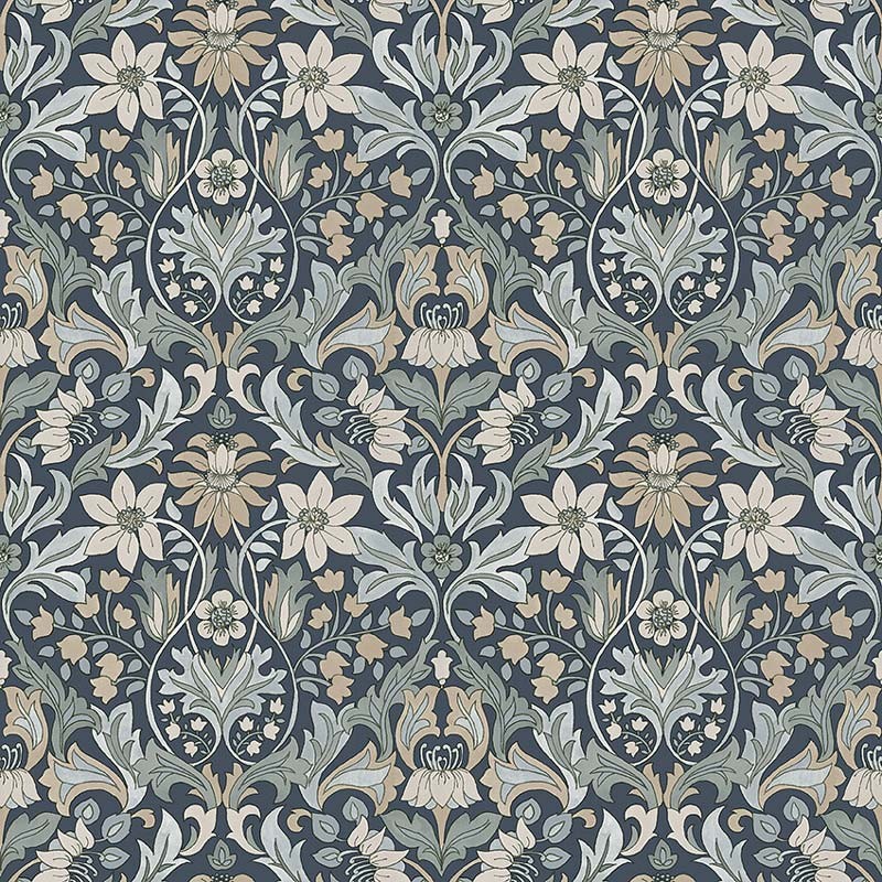 Wallpaper in fresh and calm tones of dove blue, turquoise green, beige, and pearl gray on a dark blue background, is contemporary, sophisticated, and elegant. With a delightfully dense and decorative floral pattern inspired by Arts and Crafts blooming on the walls, it creates a genuine, rich, and cozy feeling for the surrounding space. Suitable for a living room, hallway, or bedroom.