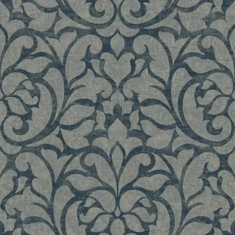 Blue and grey damask wallpaper for elegant living rooms, a refined choice for interiors with texture and subtle depth.