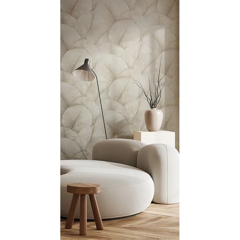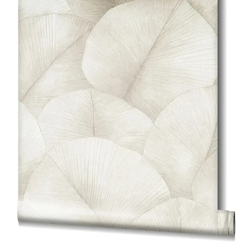 Japandi wallpaper with large leaves in white by Marburg, collection Kumano, non-woven and washable. Size: 53 cm x 10 m.