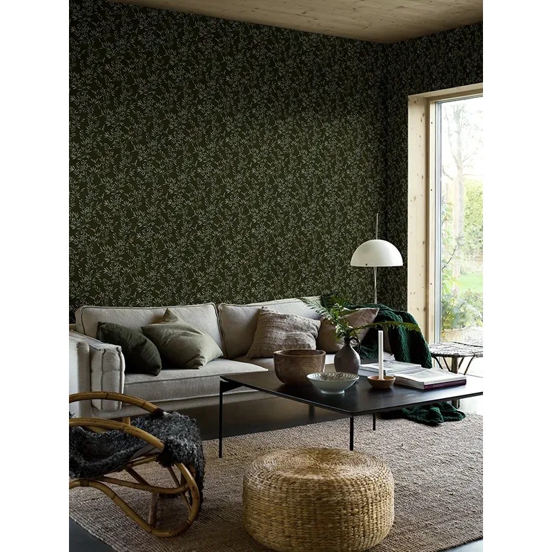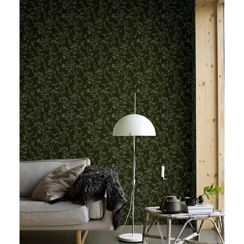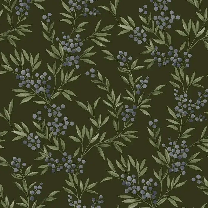 In shades of cranberry purple and fresh green on a dark black background with hints of green, our wallpaper Forest Berries is charming and striking. Explore the riches of a Nordic autumn forest at midnight. Cranberries, sloes, and inner hawthorns inspire the watercolor motif that dresses the walls with elegance and effortless style. Place it in your bedroom with a matching plain for a featured wall or on all four walls of your living room for a sophisticated look in every way.