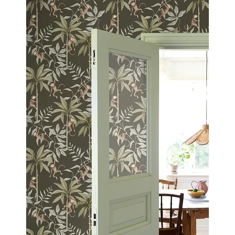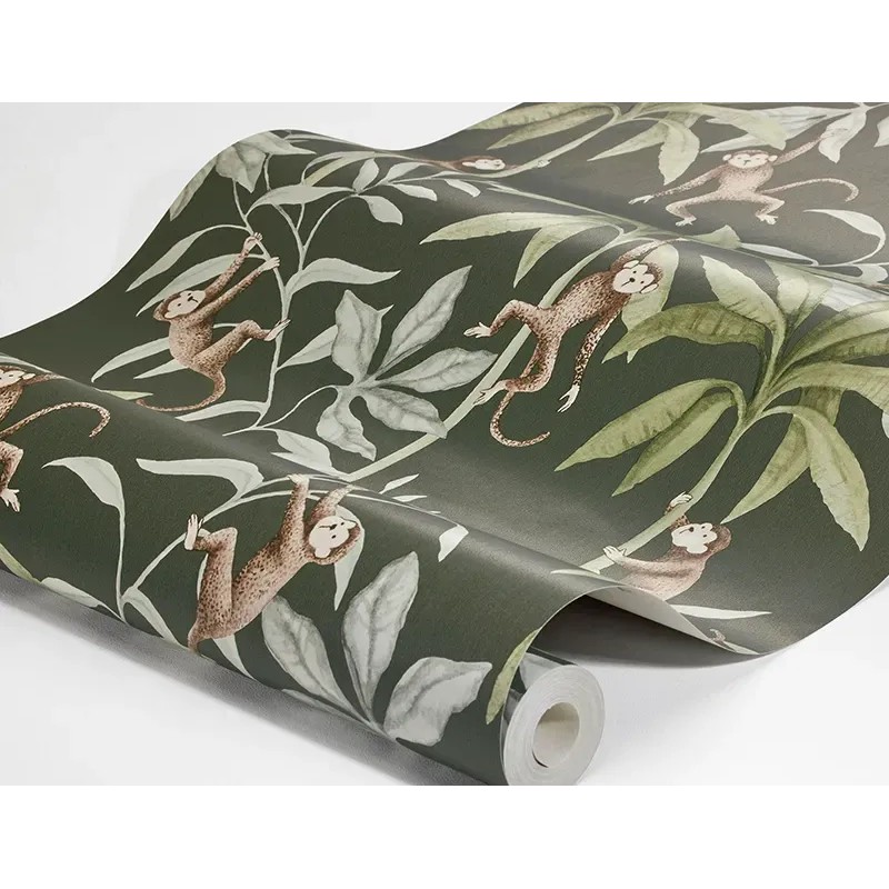 Lush colors and flourishing green and brown tones, our wallpaper Jungle Friends is ornamental and adorable. Taking you on a tropical adventure, it features a fun and captivating pattern of monkeys playing and swinging among the palm trees. This wonderful wallpaper of Jungle Friends was created in collaboration with the Newbie design studio. Hang it in your child's bedroom, nursery or playroom to add a touch of exotic charm and playful character.