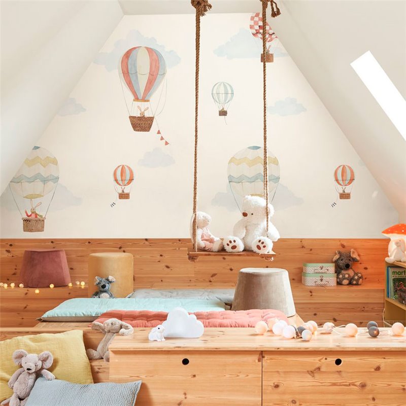 Children's Wall Mural Beautiful Village Houses and Green Landscapes with Hot Air Balloons, Casadeco Welcome To The Village Multico. Size: 200 x 310 cm
