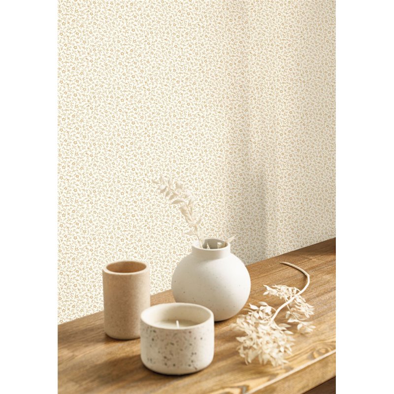 Small green flowers wallpaper, forget-me-not, ideal for hallways, living rooms or bedrooms with rustic charm.