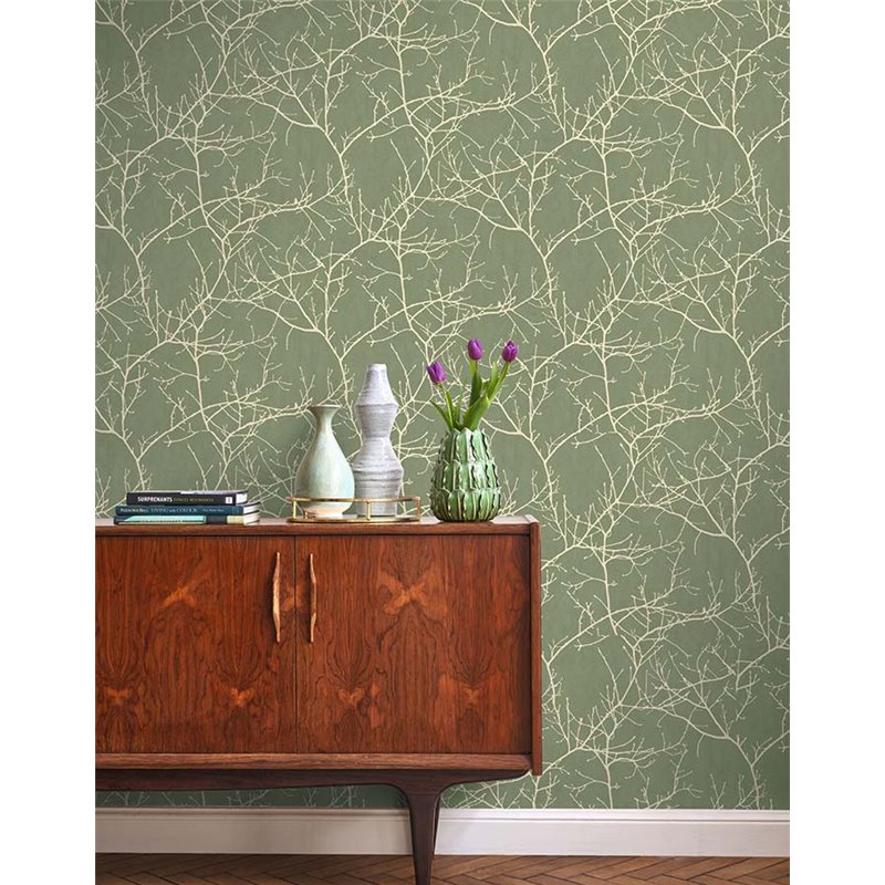 Wallpaper with bare green tree branches in nordic style, ideal for adding artistic personality to any room.