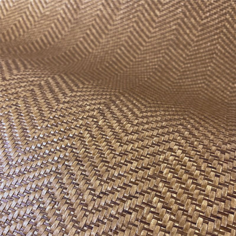 The wall covering Casamance Kasane Naturel has a natural fiber appearance, imitating the texture of braided raffia in a herringbone or chevron pattern. KASANE by Casamance is available in 8 color variations, and the pleated raffia chevrons seem to have been dyed before being woven.