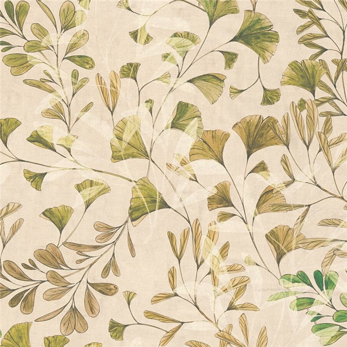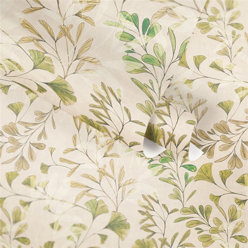 The wallpaper Painted Petals 2028782231 in green color features a botanical design with ginkgo leaves and other watercolor effect foliage with subtle details. Ideal for adding freshness and warmth to any environment.