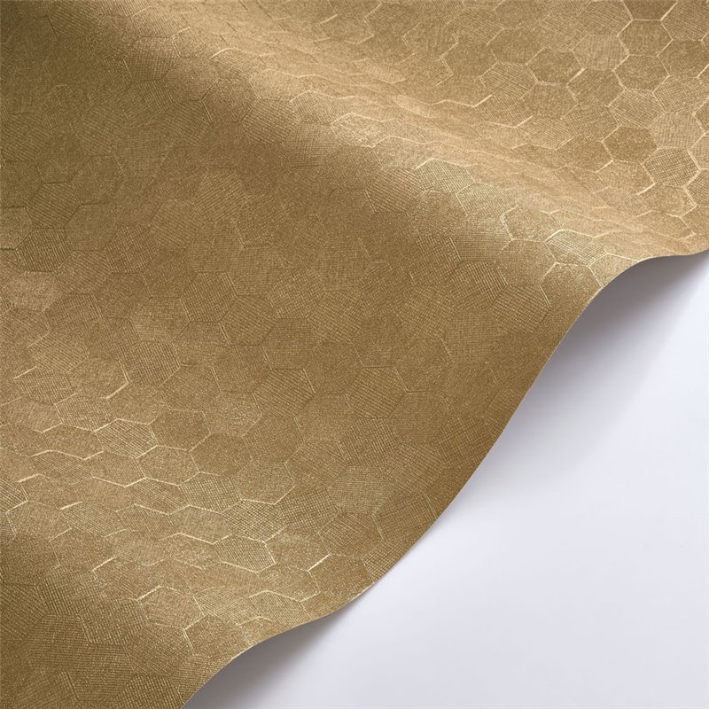 The MELI Doré wallpaper from the Casadeco Solaris collection reinterprets the honeycomb motif in a golden version with a distinctly gourmet spirit. The hexagons appear to be filled with liquid honey and reflect light with a warm glow, ideal for a dining room, an elegant kitchen, or a bar nook. The iridescent effect accentuates the sense of relief and transforms the wall into an almost jewel-like surface.
