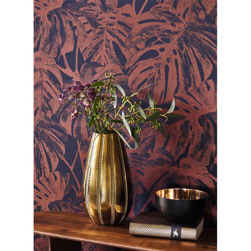 The MATA Amarena wallpaper from the Casadeco RIO collection combines the graphic silhouettes of monstera leaves with an intense and sophisticated amarena tone. This mix of vegetal and deep color creates a wall with great personality, perfect for a dining room, a lounge corner, or a bedroom with a theatrical air. The stencil-type design maintains visual lightness and allows for very decorative compositions alongside golden, black, or dark wood details, as well as with the Ocelot frieze.