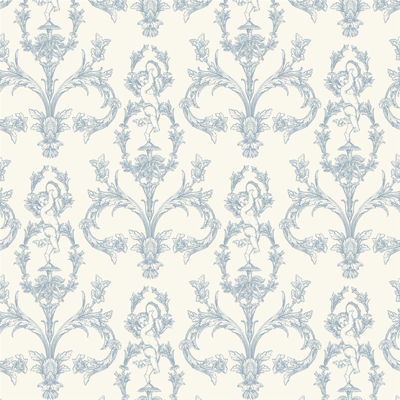 The wallpaper Séraphin Bleu Porcelaine from the Les Belles Toiles de Jouy 2 collection by Casadeco combines classic charm and decorative lightness with a flock of cherubs flying over vegetal arabesques. The design, both dynamic and delicate, creates a poetic scene reminiscent of traditional prints reinterpreted with contemporary sensitivity. Its porcelain blue tone brings fresh elegance and a serene air, perfect for bright bedrooms or living rooms. The collection reimagines Toile de Jouy in 100% non-woven wallpaper, with a refined and timeless finish.