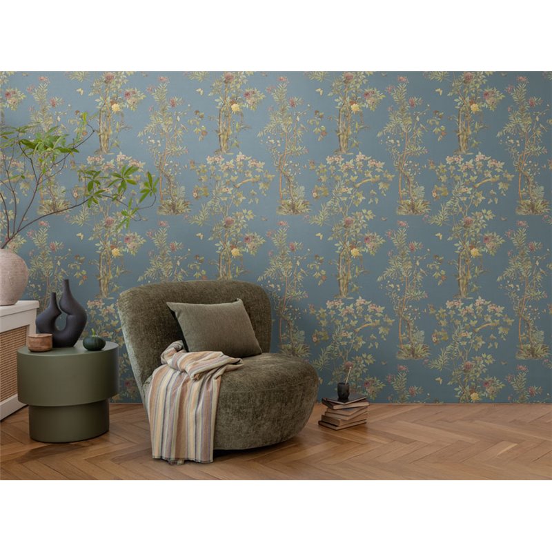 Floral pattern in romantic chinoiserie style with birds in blue, a wallpaper designed for boutiques or commercial spaces seeking a carefully curated image.