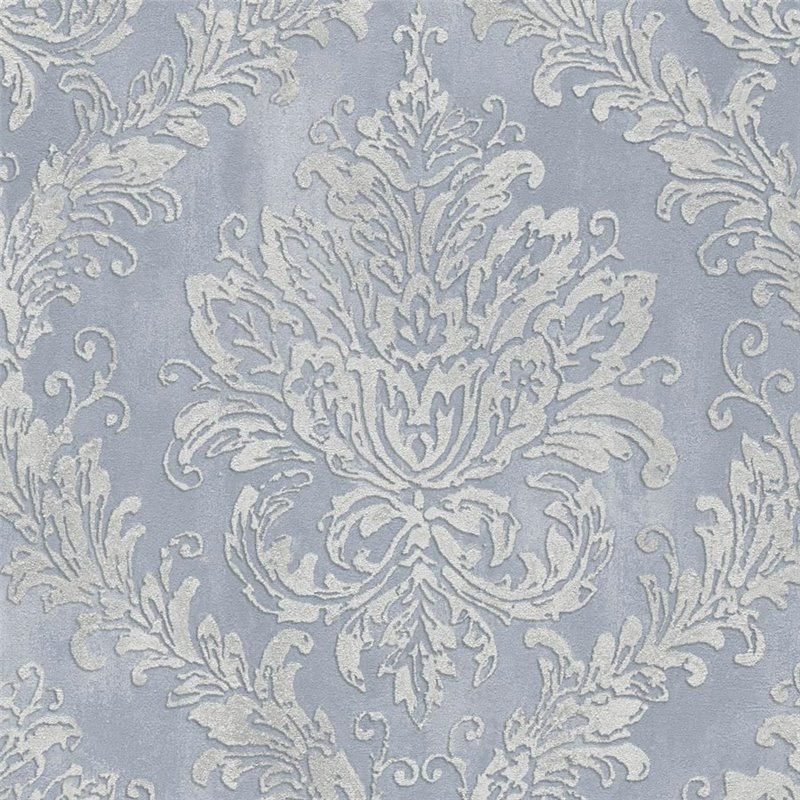 Damask metallic motif in blue, a wallpaper ideal for the living room that adds sophistication and decorative reflections.
