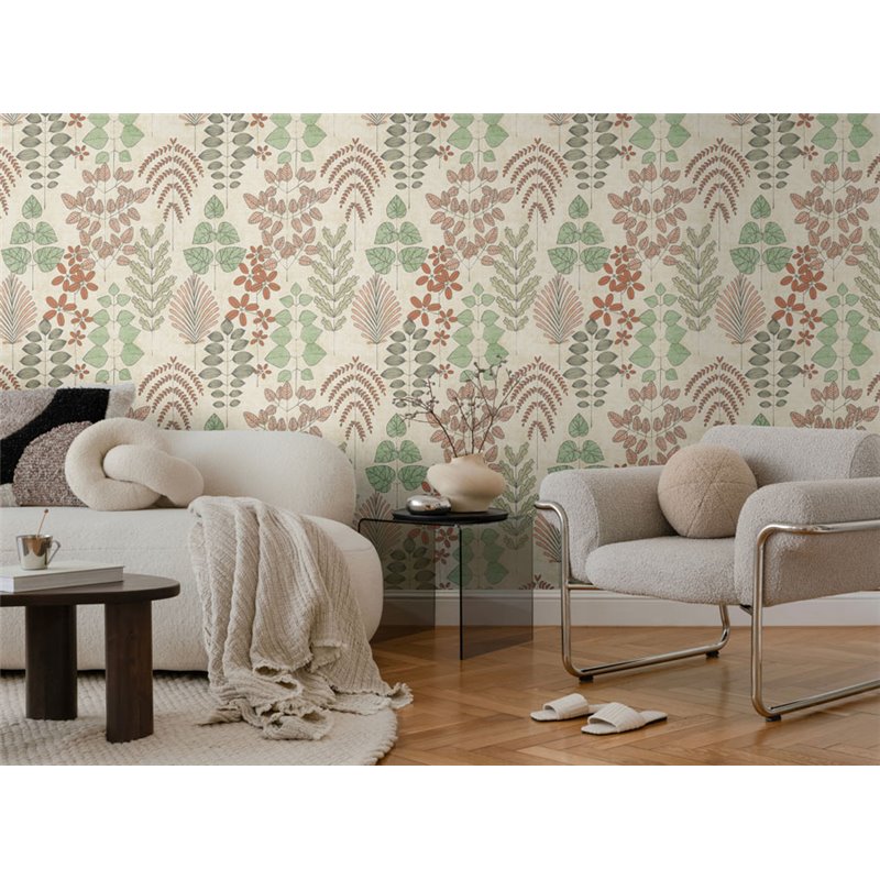 Beige colouring with a modern Scandinavian floral style makes this wallpaper a warm and elegant choice for the living room.