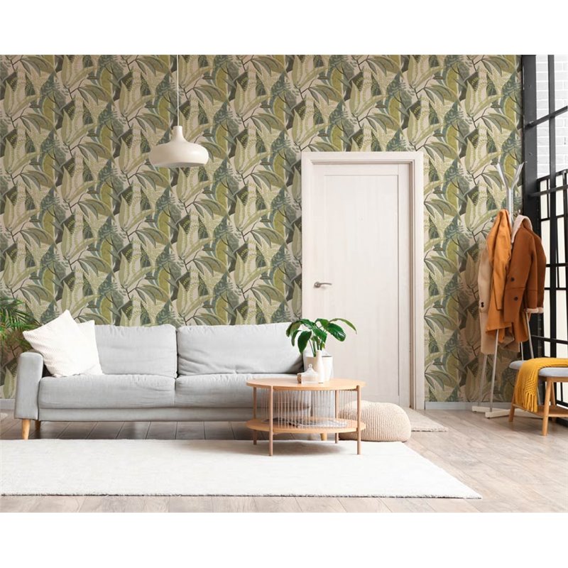 The use of tropical plants in green tones gives this wallpaper a fresh and natural atmosphere for hospitality spaces.