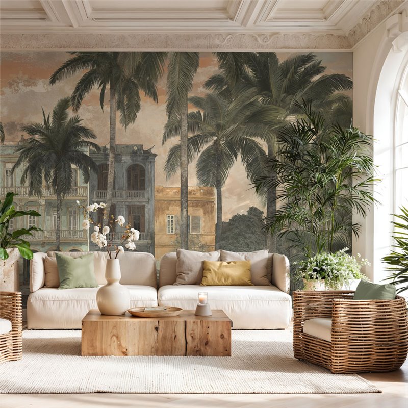 Blending palm trees and colonial architecture, this wall mural suits an elegant living room or restaurant interiors with refined tropical inspiration.