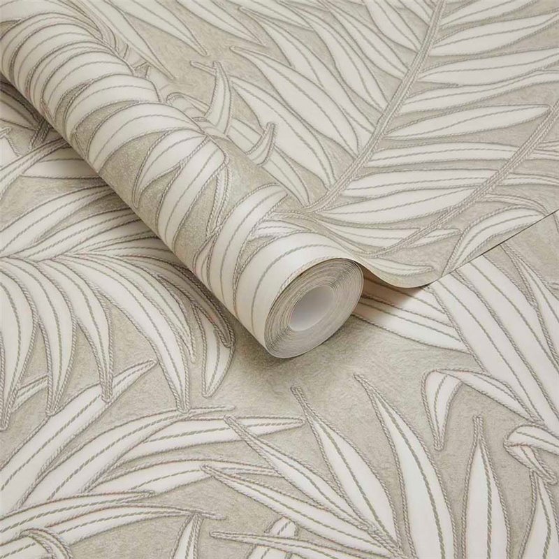 This botanical-style wallpaper with ferns and exotic leaves in neutral green creates a fresh and naturally enveloping atmosphere.
