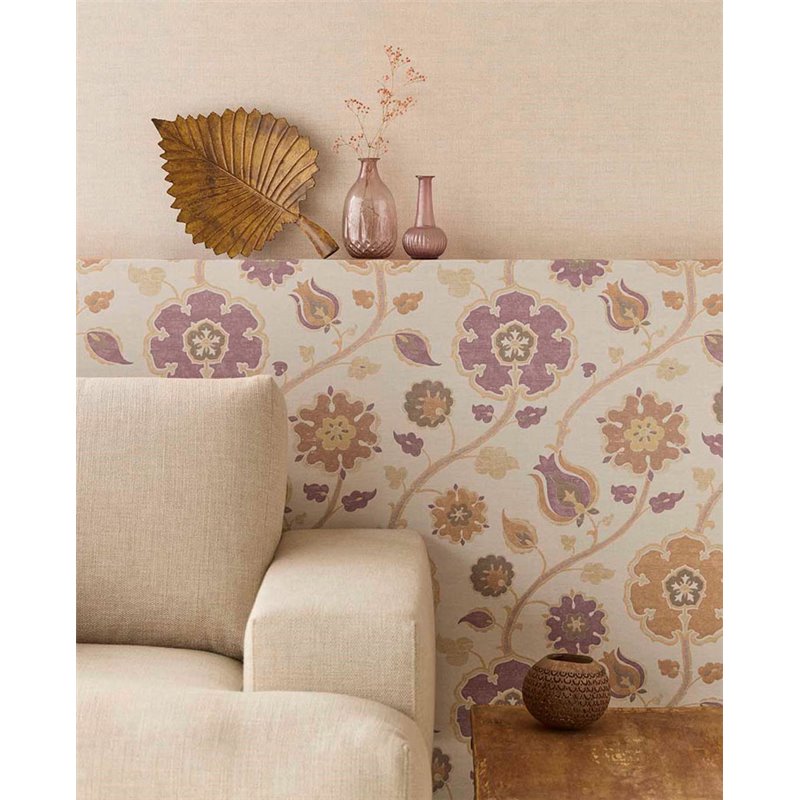 Museum-style Indian floral pattern with contemporary colors, this floral wallpaper in beige and lilac adds sophistication and personality to the living room.