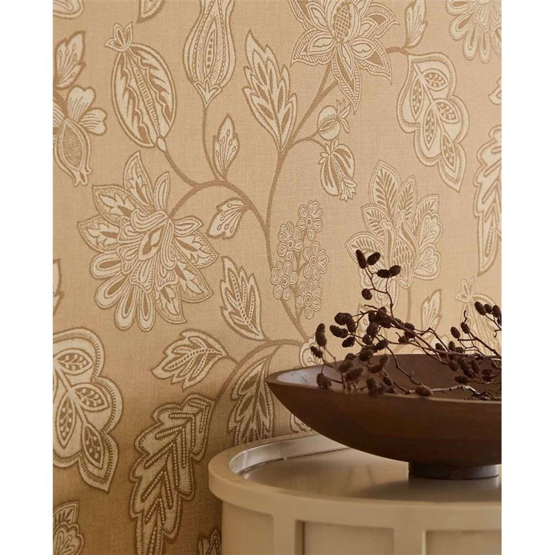 Vintage wallpaper with large beige flowers featuring a floral garland and delicate embossed lines that add texture and visual depth.