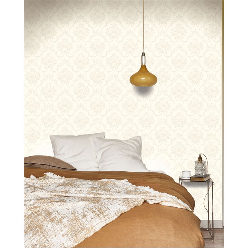 White damask wallpaper in classic style with metallic sheen, ideal for bedroom.