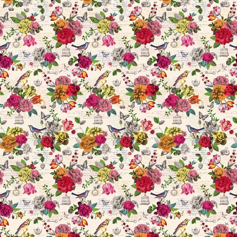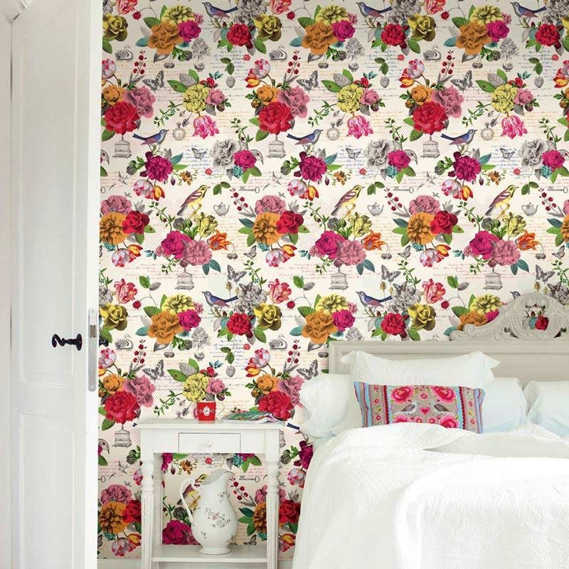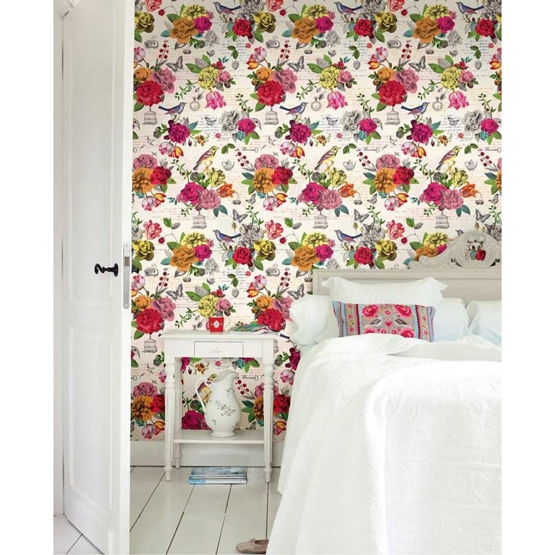 Mural pared romántico, flores y pájaros vintage