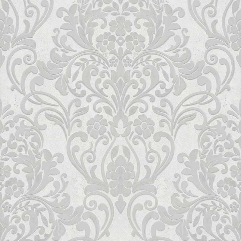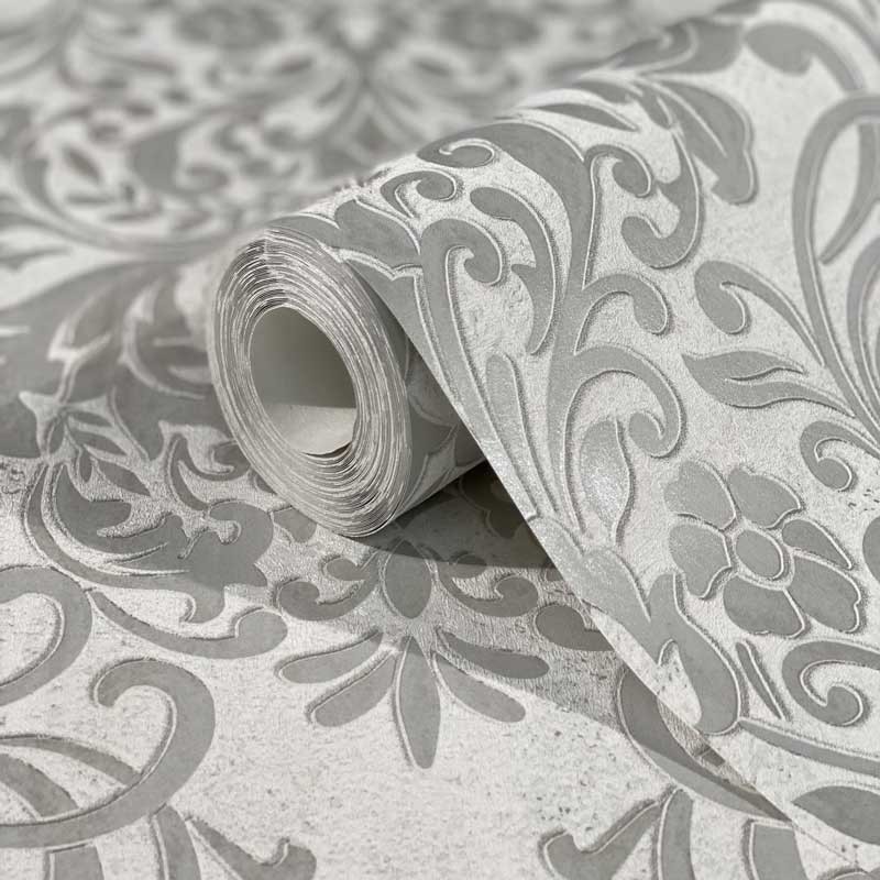 Papel pintado damasco gris metalizado con efecto hormigón. Vendido por rollo, medidas: 53 cm x 10 metros