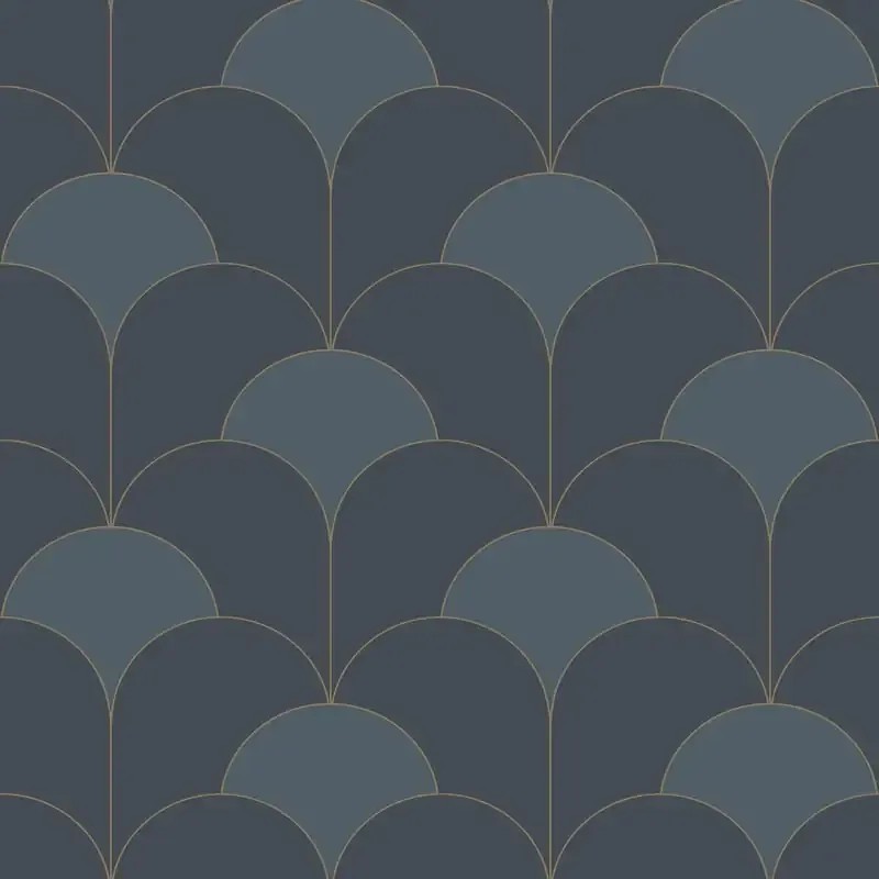 Papel pintado glamuroso art deco con arcos azules y oro metalizado, una elección sofisticada para estancias que buscan textura y personalidad.