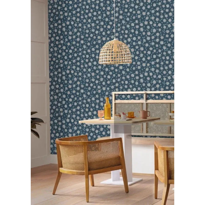 Papel pintado flores azul, enredadera de margaritas. Caselio Essentiel, papel de pared calidad tejido no tejido lavable. Medidas: 53 cm x 10 metros