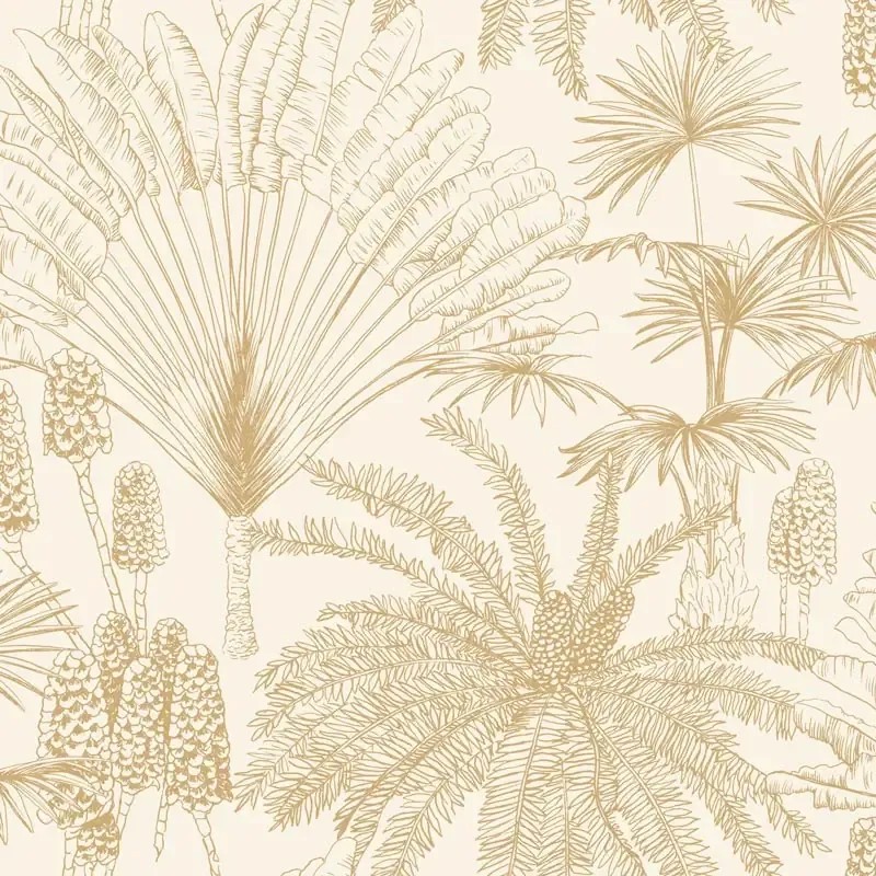 Papel pintado grabados de palmeral tropical blanco y dorado
