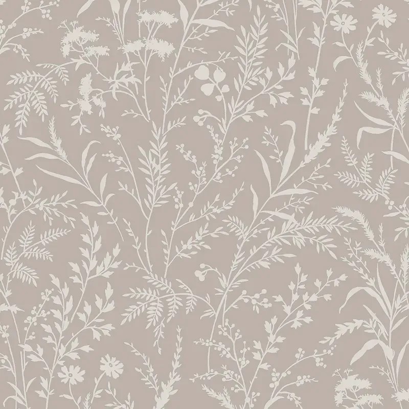 Papel pintado escandinavo flores y hojas de prado en marrón de Borastapeter, colección Borosan Hem. Calidad tejido no-tejido lavable, medidas: 53 cm x 11,2 m.
