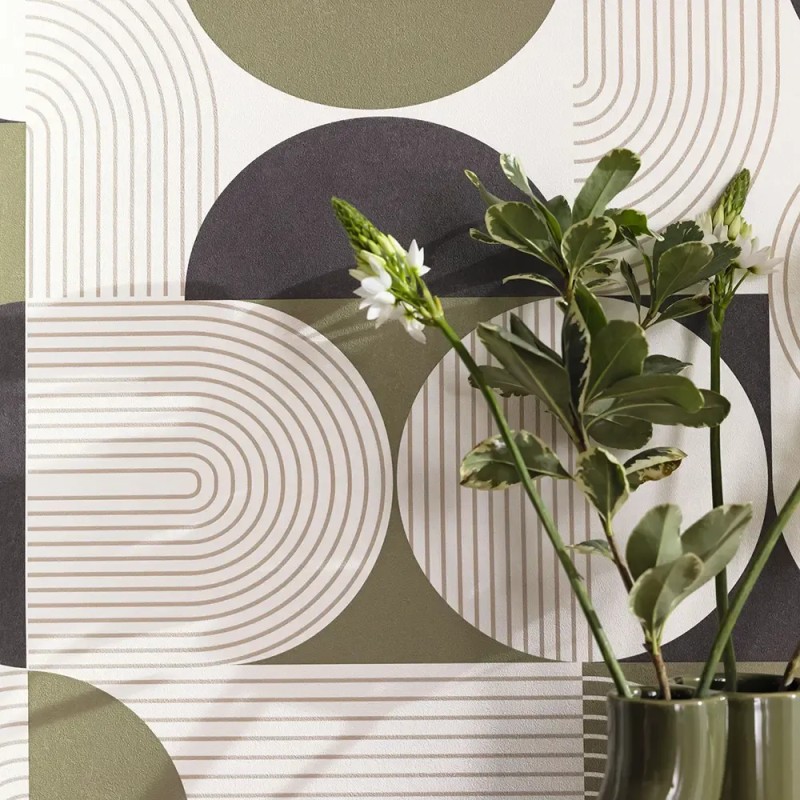 Papel pintado estilo moderno verde, patrón geométrico con círculos