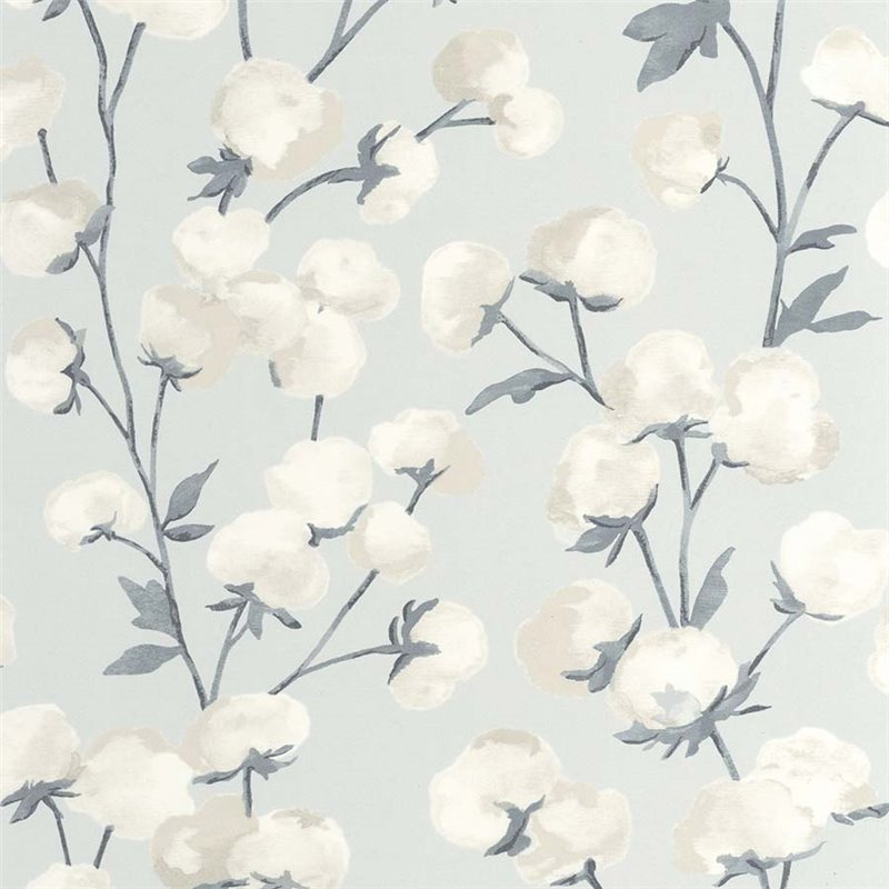 Papel pintado floral para dormitorio con flor de algodón azul pastel. Flores suaves en azul para un dormitorio tranquilo.