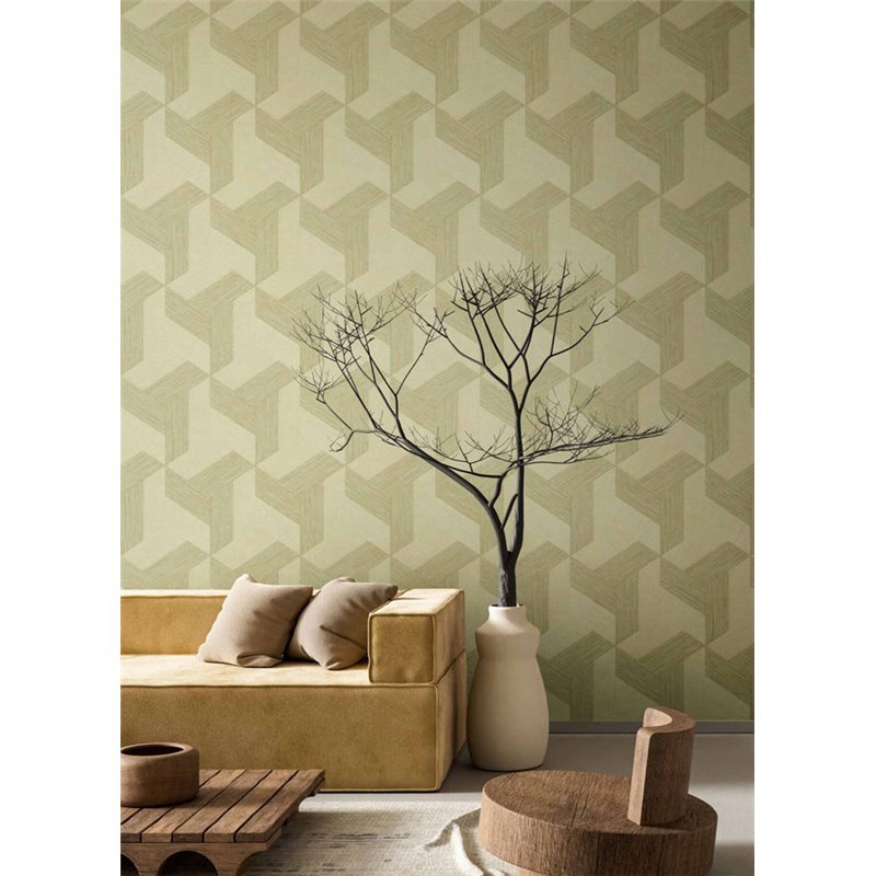 El papel pintado geométrico verde Sintesi 27505 de Cristiana Masi fusiona frescura y diseño gráfico para dar personalidad y dinamismo a cualquier interior con gusto moderno.