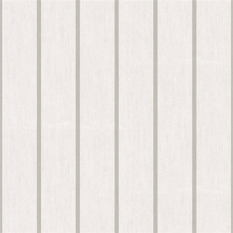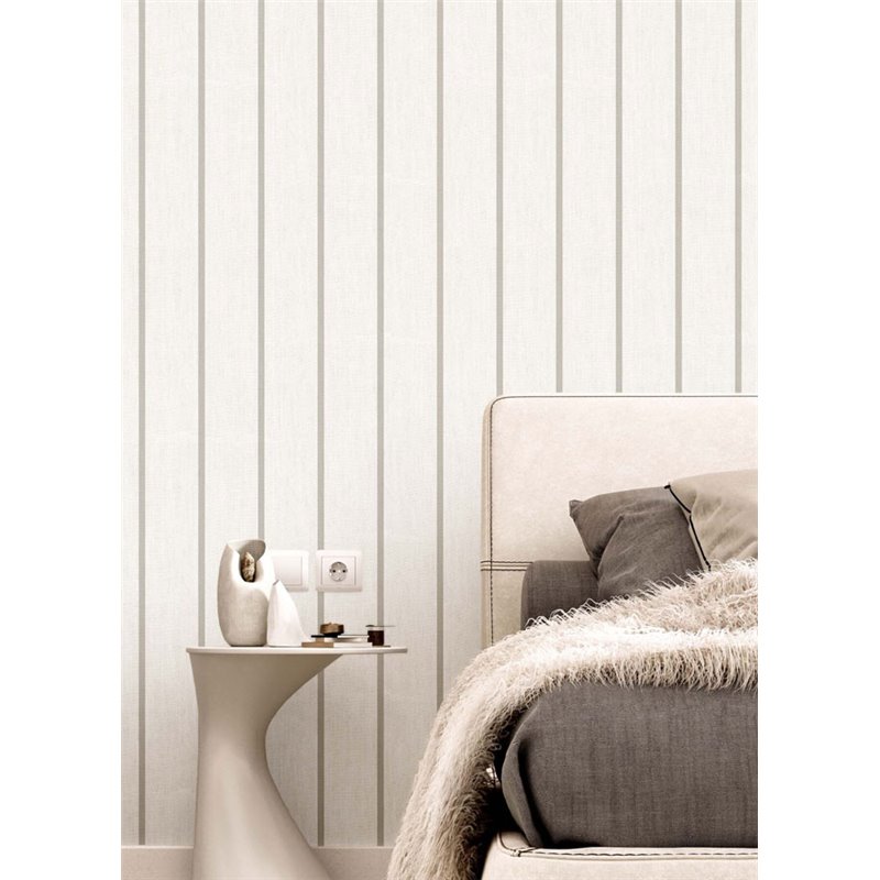 Papel pintado de rayas grises y blancas con textura textil. Un diseño escandinavo que aporta luz y orden visual a cualquier estancia.