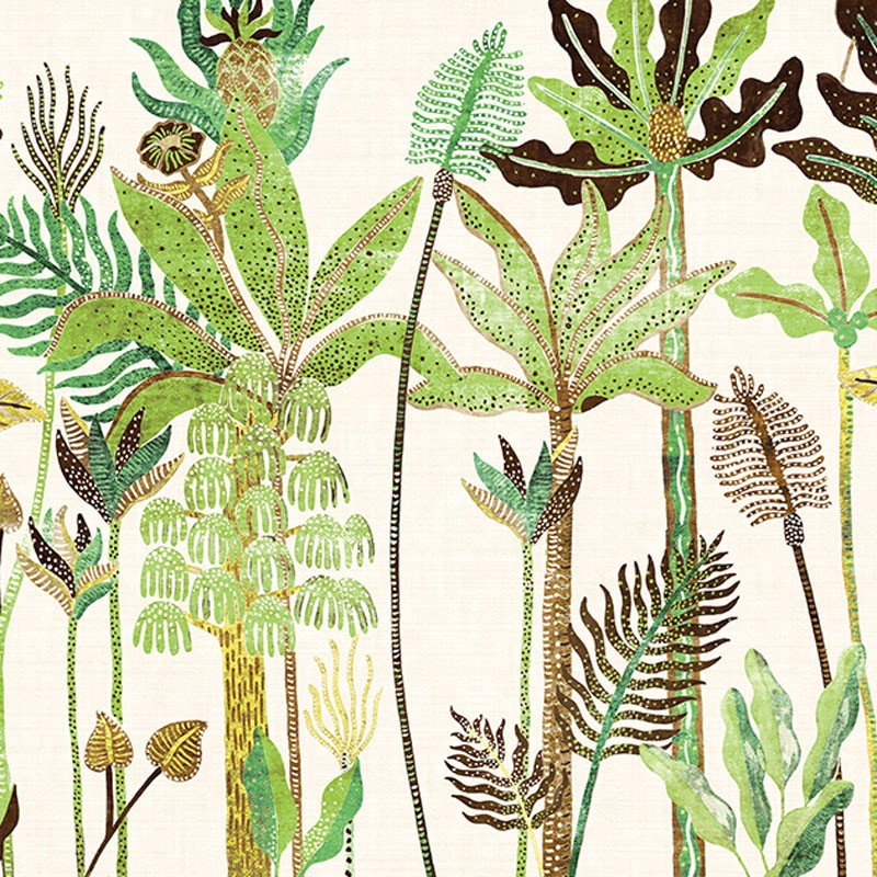 Murale composé de 3 panneaux décoratifs imprimé numériquement, inspiré par les palmiers typiques de La Havane avec une variété de feuilles tropicales. Sa variété de plantes, de points et de rayures produit un résultat résolument amusant. Ce papier peint ou photomural imprimé présente un fond avec un effet textile beige inégal.