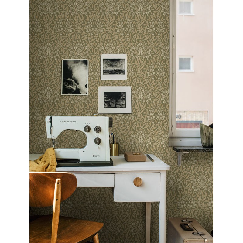 Papier peint floral sinueux style arts and crafts beige d´Borastapeter, collection Alla Tiders Hus. Qualité intissé et lavable, dimensions : 53 cm x 10 m.