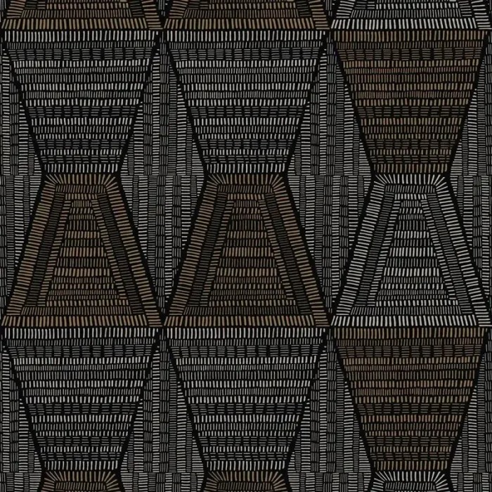 Papier peint ethnique tribal africain métallisé d´Casamance, collection Mirage. Qualité vinyle lavable, dimensions : 53 cm x 10 m.