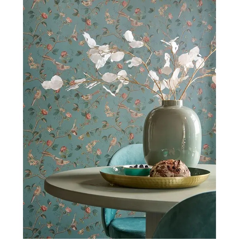 Papier peint romantique fleurs et oiseaux bleu, une scène douce et élégante qui invite au romantisme. Pip Studio de Eijffinger, papier peint intissé lavable. Dimensions : 52 cm x 10 m