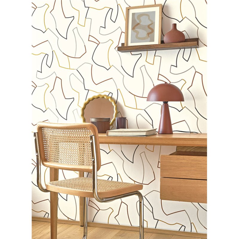 Papier peint style moderne beige et doré, motif labyrinthe. Lignes dorées pour un salon luxueux et moderne.