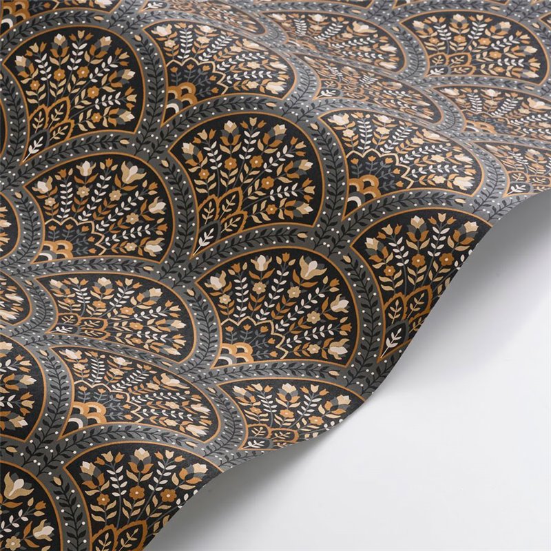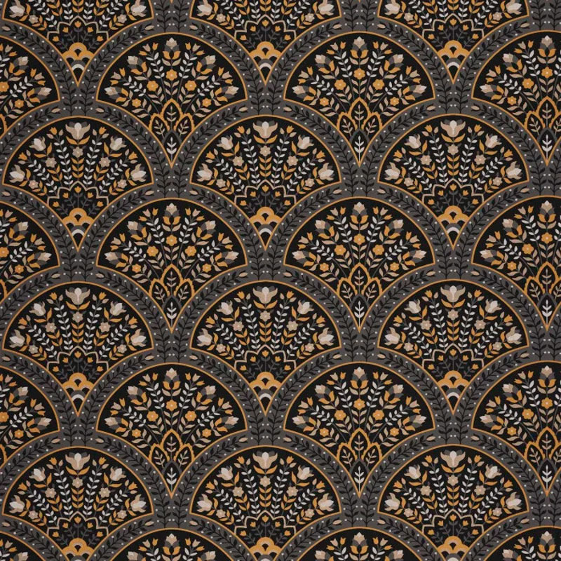 Papier peint floral avec élégants éventails couleur moutarde. Vibrant pour une salle à manger raffinée.