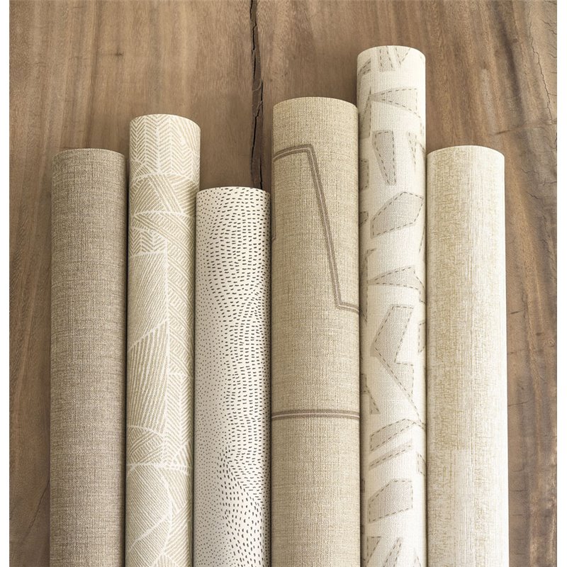 Papier peint Caractère de Casadeco en beige taupe, avec un effet lin chiné sophistiqué qui enveloppe la pièce de calme et d’équilibre.