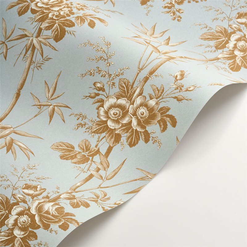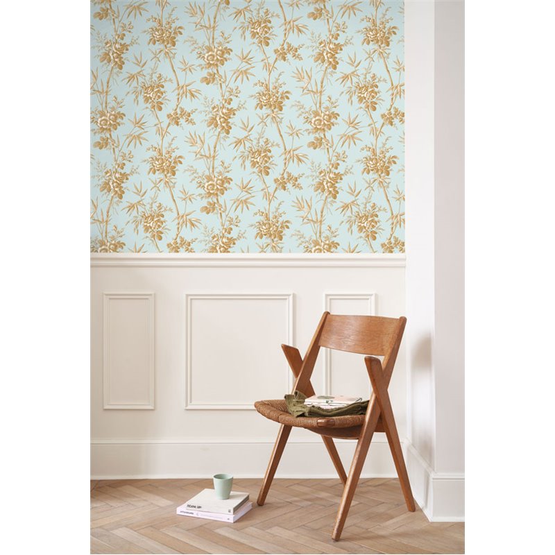 Papier peint classique floral bambou et roses bleu
