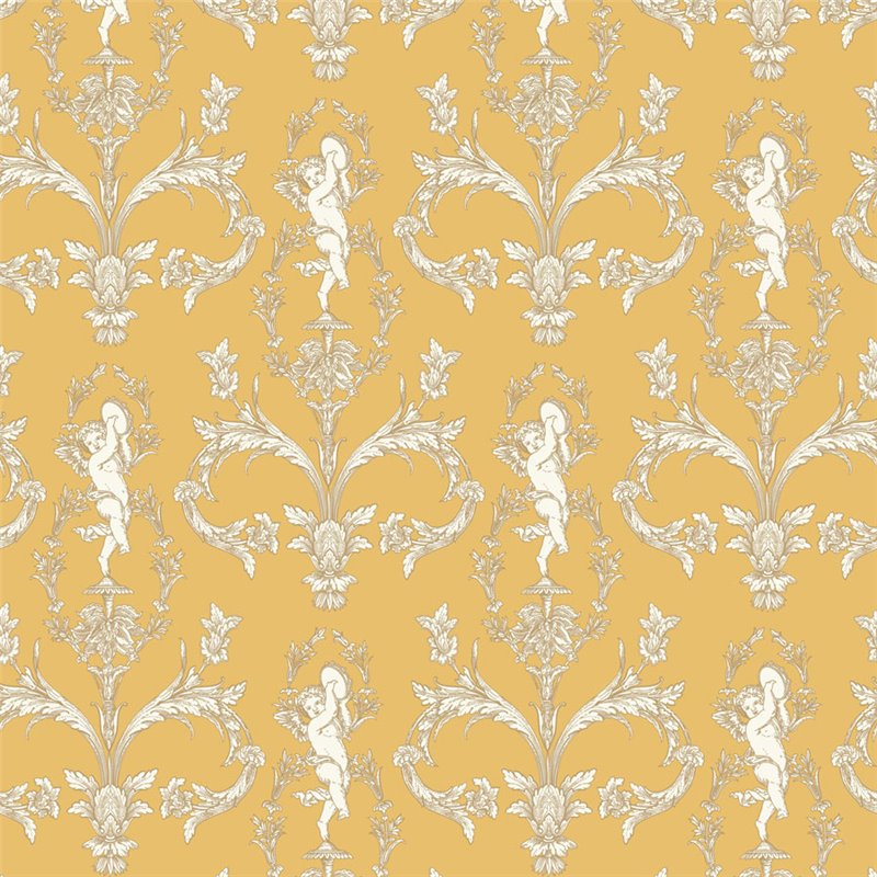 Papier peint Séraphin de Casadeco, un décor délicat où de gracieux angelots virevoltent parmi des arabesques végétales ; un motif à la fois dynamique et poétique qui apporte charme et légèreté aux intérieurs.