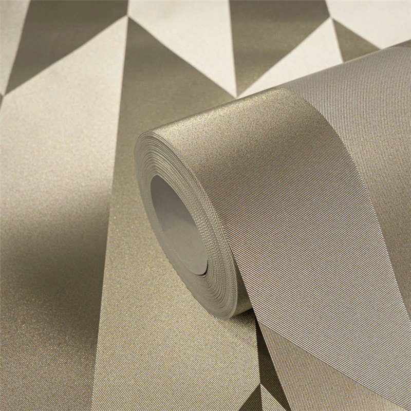 Papier peint moderne à motifs géométriques en tons argentés pour le salon, avec une finition brillante et une surface lisse qui apportent une touche contemporaine et sophistiquée.