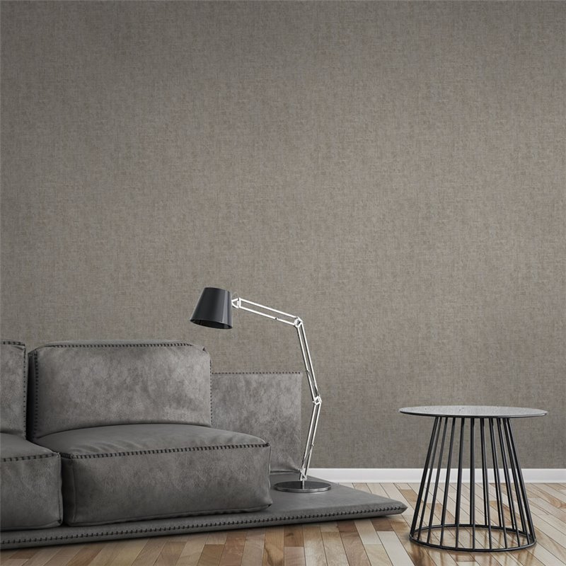 Finition unie texturée effet stuc marron pour le salon, un papier peint avec un fini stuc et des nuances artisanales qui renforcent une atmosphère chaleureuse et sophistiquée.