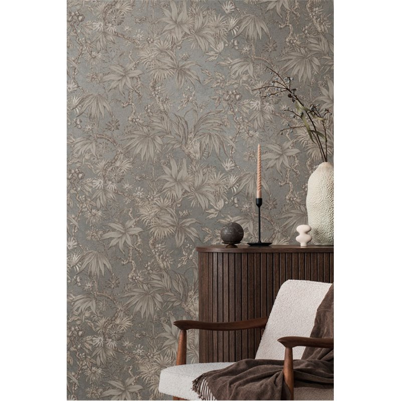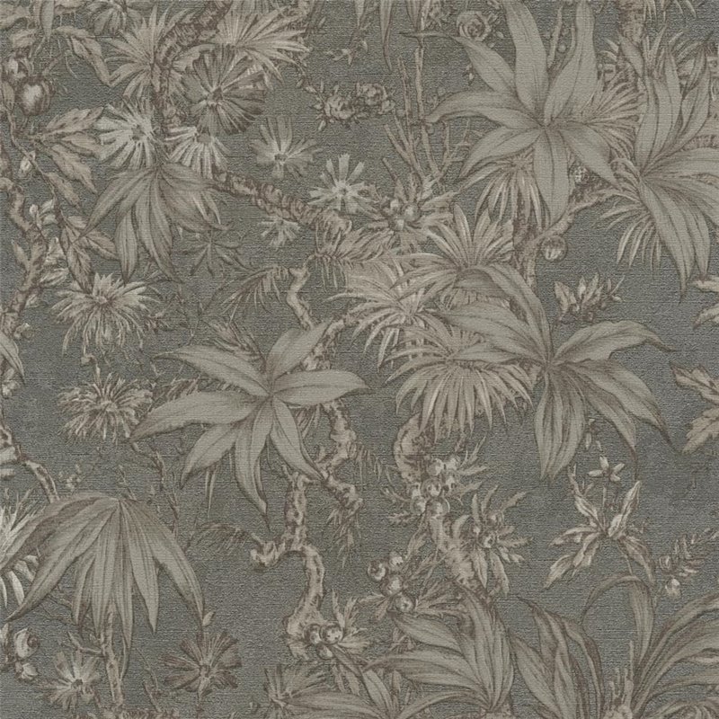 Motif jungle tropical de style colonial en gris, un papier peint pour le salon qui associe élégance et personnalité décorative.