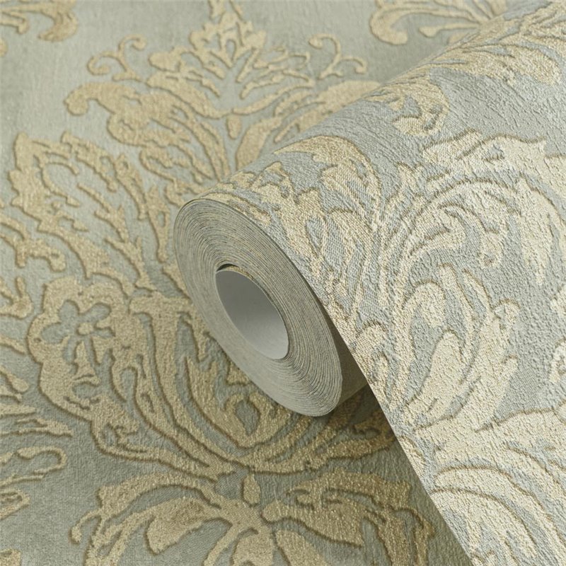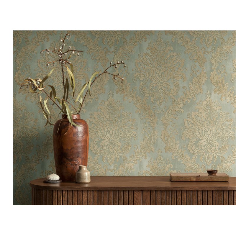 Design damassé avec brillance en bleu turquoise, un papier peint qui met en valeur les murs avec une finition lumineuse et raffinée.
