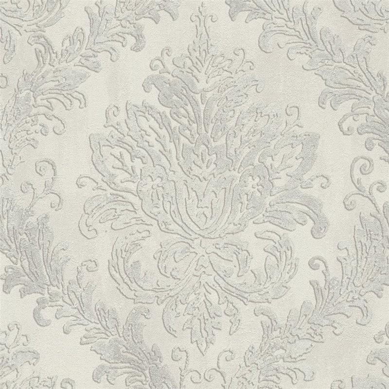 Composition damassée en argent et beige, un papier peint pensé pour les boutiques de luxe avec une esthétique sophistiquée et harmonieuse.