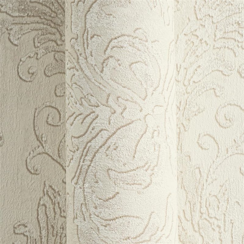 Design damassé avec brillance en beige, un papier peint pour le salon qui apporte luminosité et un classicisme revisité.
