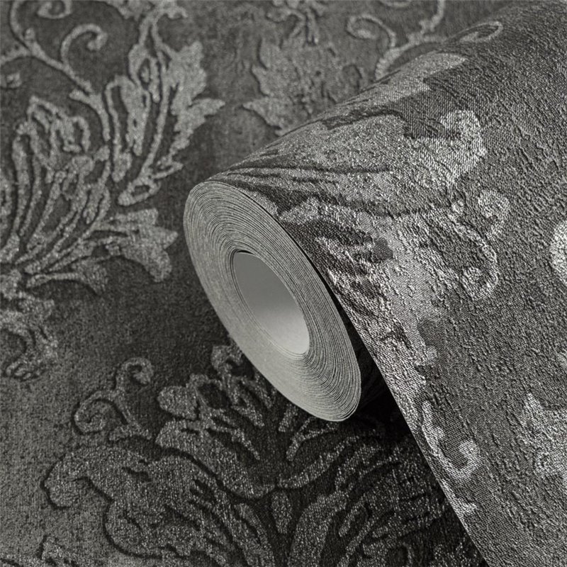 Motif damassé en noir et argent, un papier peint adapté aux intérieurs recherchant contraste et caractère décoratif.